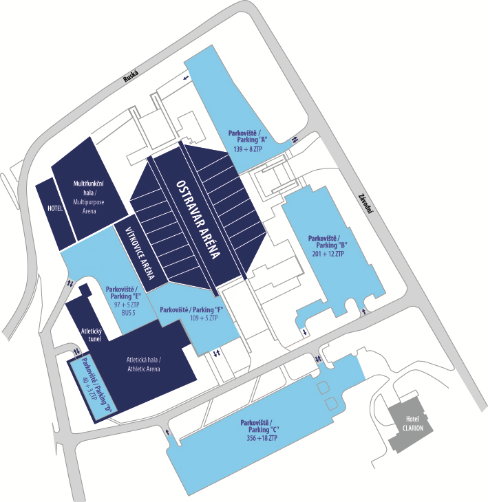 Na parkovištích u OSTRAVAR ARÉNY je k dispozici 959 míst k parkování + 51 míst pro ZTP.